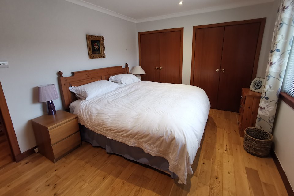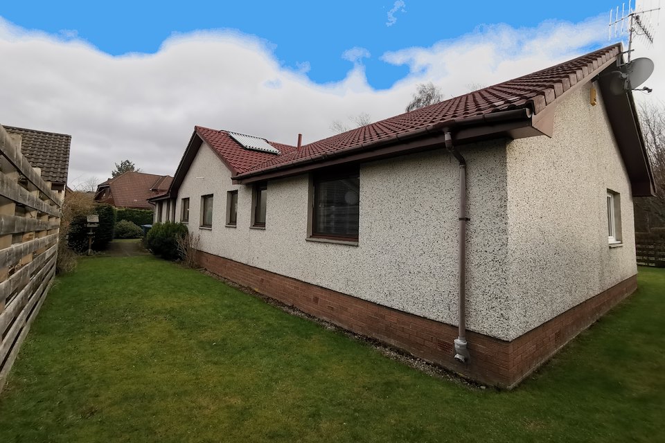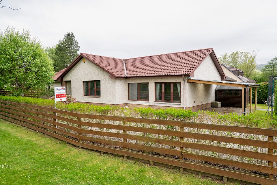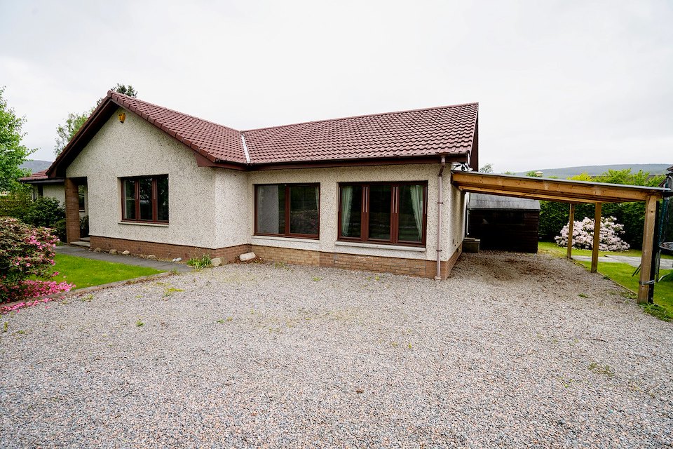 Spacious four bedroom detached bungalow within walking distance of the village with outstanding views to the Cairngorms and nearby woodlands and the river Spey. The championship Spey Valley golf course and nearby leisure club enhances the location of this property which is being offered for sale in walk in condition with furnishings by arrangement. The property has been extended into the integral double garage to create a further spacious king size bedroom with full en-suite bathroom. Low maintenance garden / car port - timber garden shed.